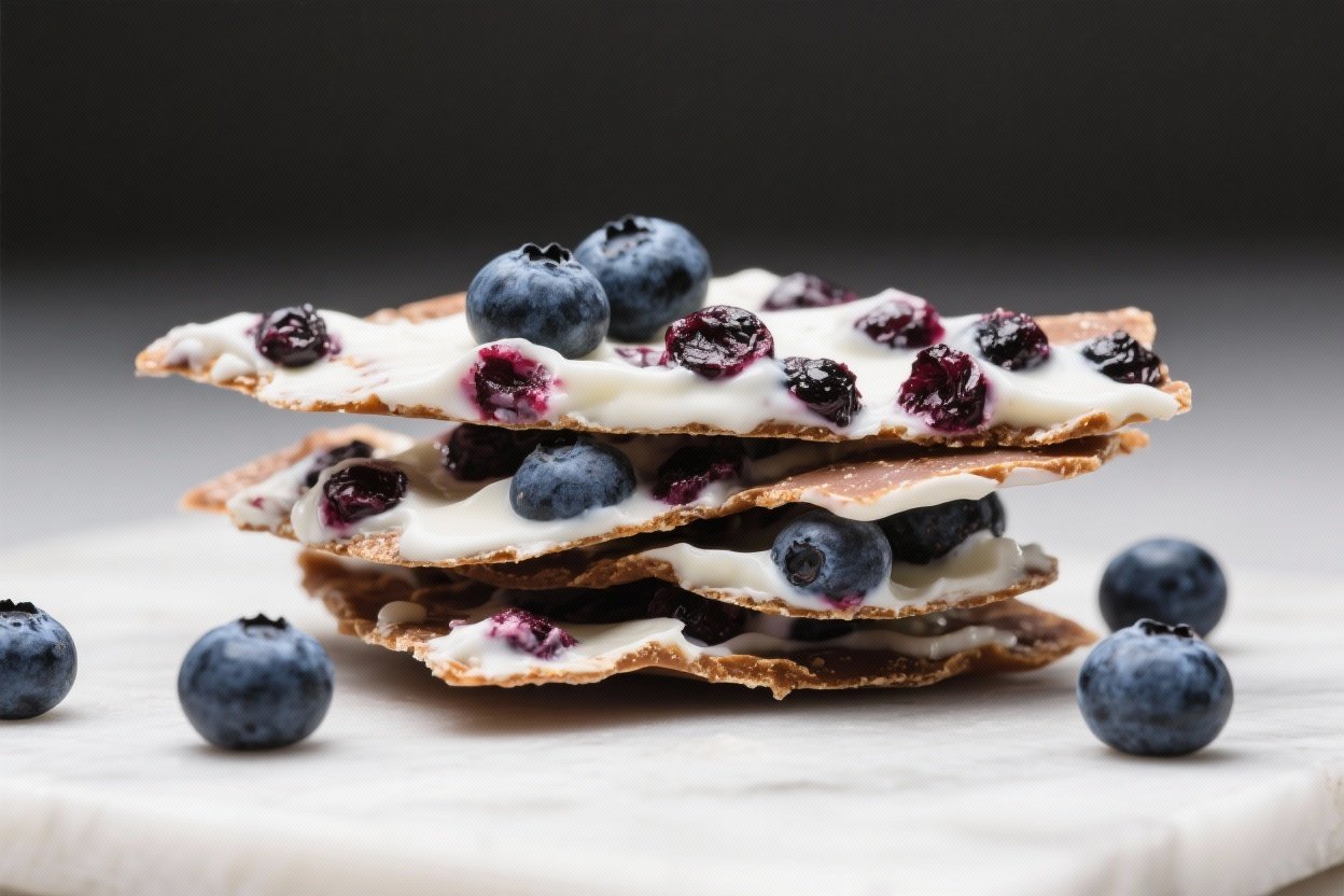 This bark hits the sweet spot between indulgence and intention. The base is thick Greek yogurt, lightly sweetened and smoothed into a canvas for juicy blueberries and crunchy add-ins.