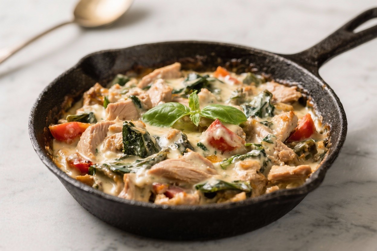 This skillet leans on classic Tuscan-inspired flavors—garlic, herbs, sun-dried tomatoes, and cream—while keeping things light with lean turkey and fresh spinach. The sauce is lush and balanced, with a touch of brightness from lemon and a savory nudge from Parmesan.