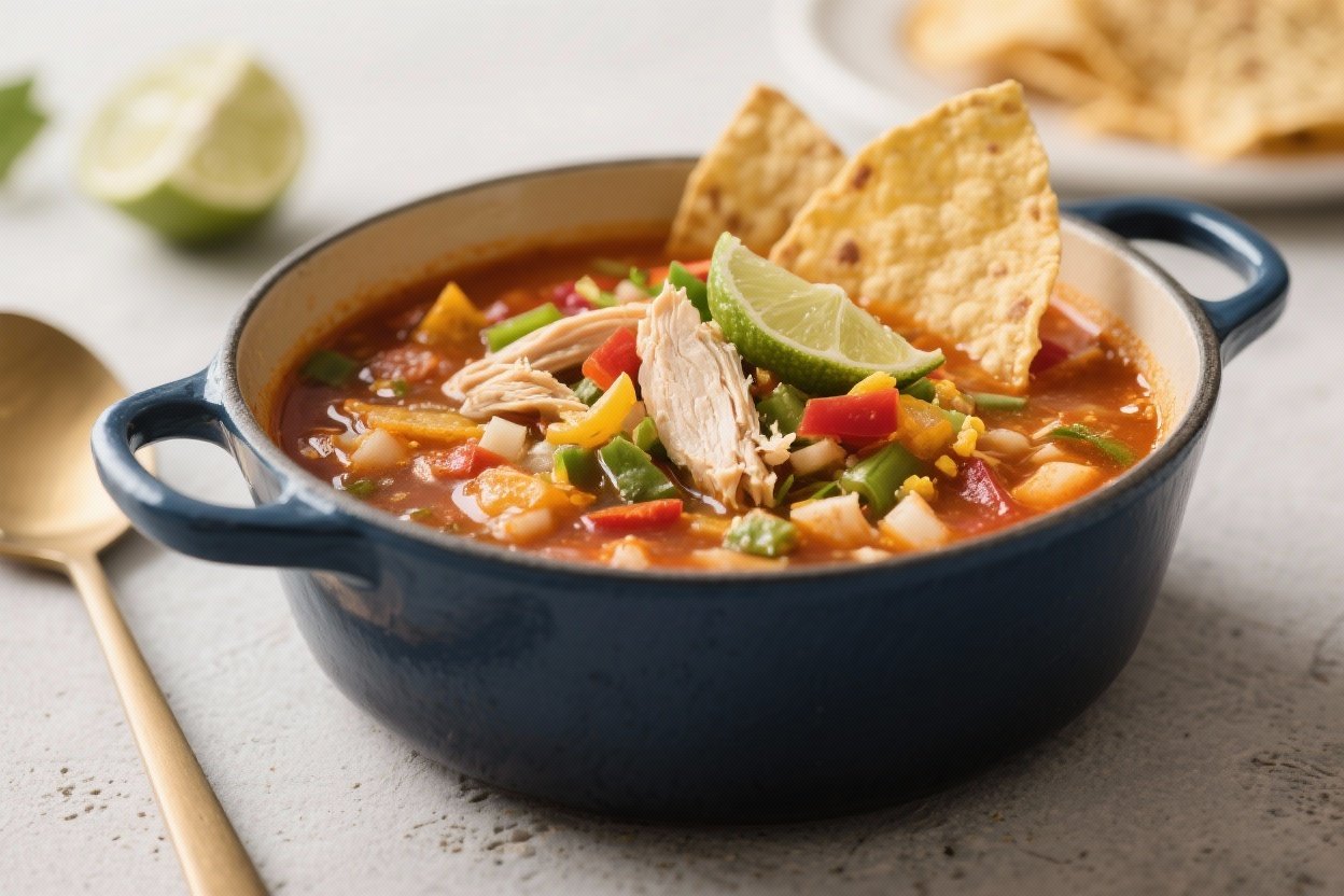 This is the kind of soup that makes a weeknight feel special. It’s hearty without being heavy, packed with bright flavors, and comes together in one pot with minimal fuss. You get tender chicken, a savory tomato-chile base, and lots of colorful veggies, all topped with crunchy tortilla strips and creamy garnishes.