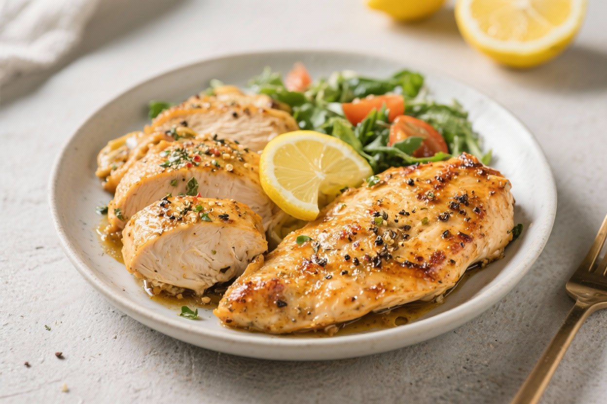 The marinade uses lemon juice and olive oil to keep the chicken moist and help the seasoning cling. A quick sear locks in juices, and finishing in the oven (or on the stovetop) ensures even cooking. It’s designed to pair easily with high-protein sides like quinoa, Greek yogurt sauces, or beans.