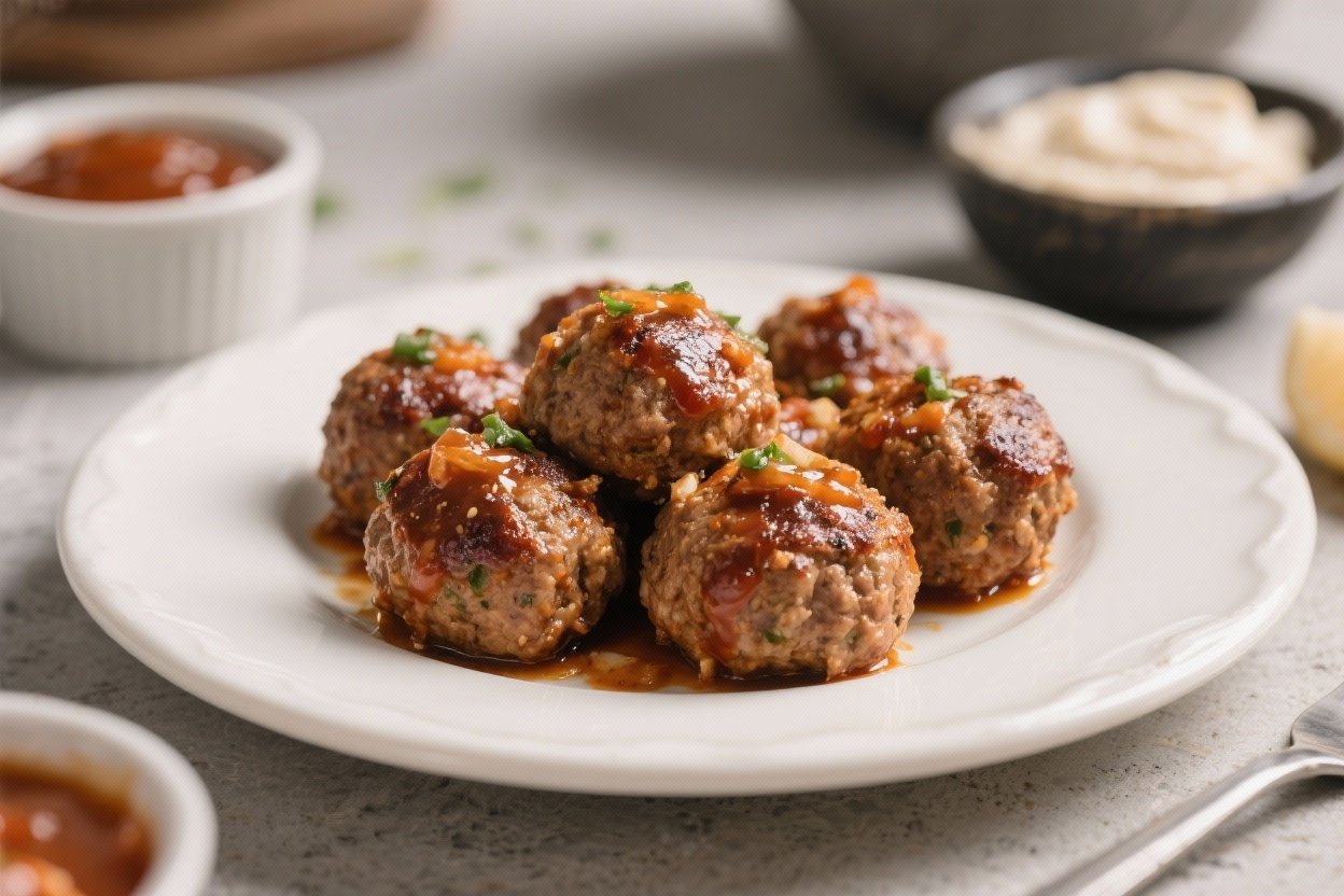 - Glaze and finish: Remove the meatballs, brush generously with the BBQ glaze, and return to the oven for 5–7 minutes. They should be glossy, lightly caramelized, and reach an internal temp of 165°F (74°C).