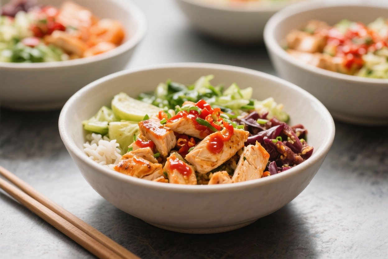 A smart bowl layers lean protein, fiber, and flavor. Chicken breast delivers high-quality protein to support muscle and keep you satisfied. Veggies add volume, vitamins, and crunch at very few calories, so the meal feels hearty without being heavy. Cauliflower rice or a modest portion of whole grains keeps carbs in check while still giving you energy.
