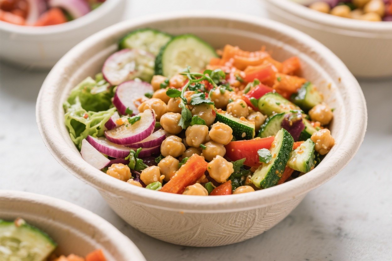 It depends on portion sizes and add-ins. A bowl with greens, 1 cup of the chickpea-veggie mix, a light drizzle of dressing, and a sprinkle of feta typically lands around 350–450 calories. Skip the feta or use less oil to keep it lower.