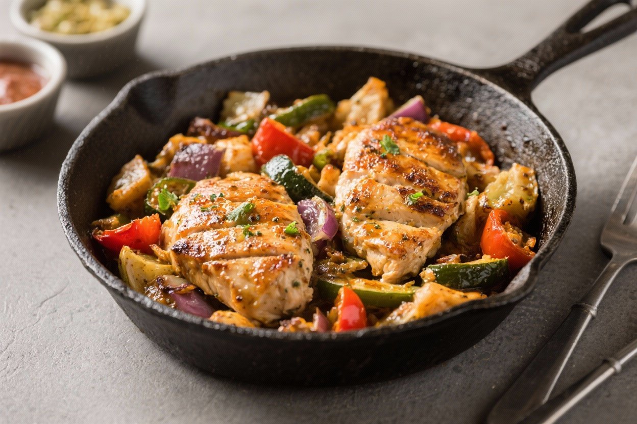 This skillet leans on the Mediterranean diet’s greatest hits: lean protein, olive oil, vegetables, and fresh herbs. Chicken thighs offer iron and B vitamins, while olive oil provides heart-friendly monounsaturated fats. Tomatoes and peppers bring antioxidants like vitamin C and lycopene.