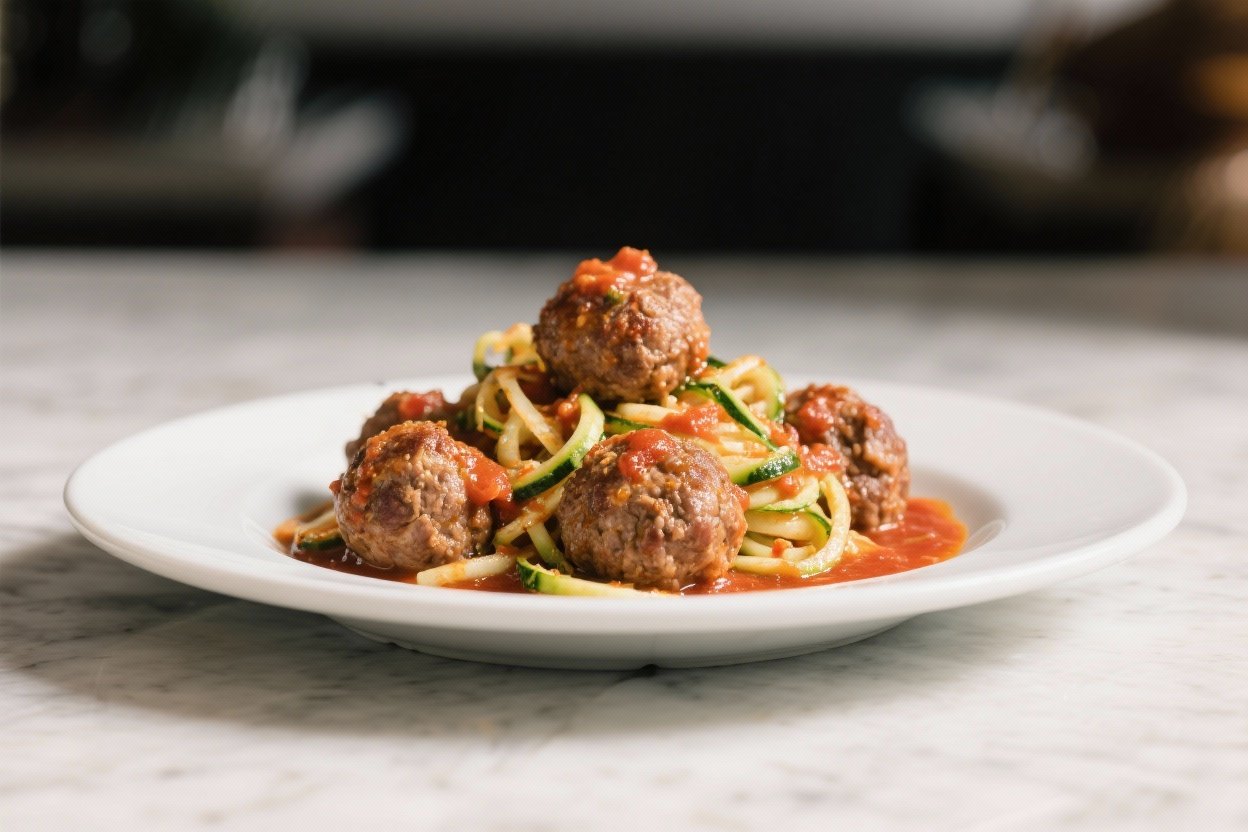 - Assemble and serve: Plate zoodles, spoon meatballs and marinara over the top, and finish with fresh herbs, a shower of Parmesan, and a pinch of red pepper flakes. A touch of lemon zest? Chef’s kiss.